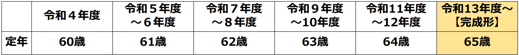 令和5年4月に、国家公務員法等の一部を改正する法律(令和3年法律61号)が施行され、国家公務員の定年が引き上がります。これにより、令和4年度まで60歳とされていた原則となる定年年齢は、下表のとおり、