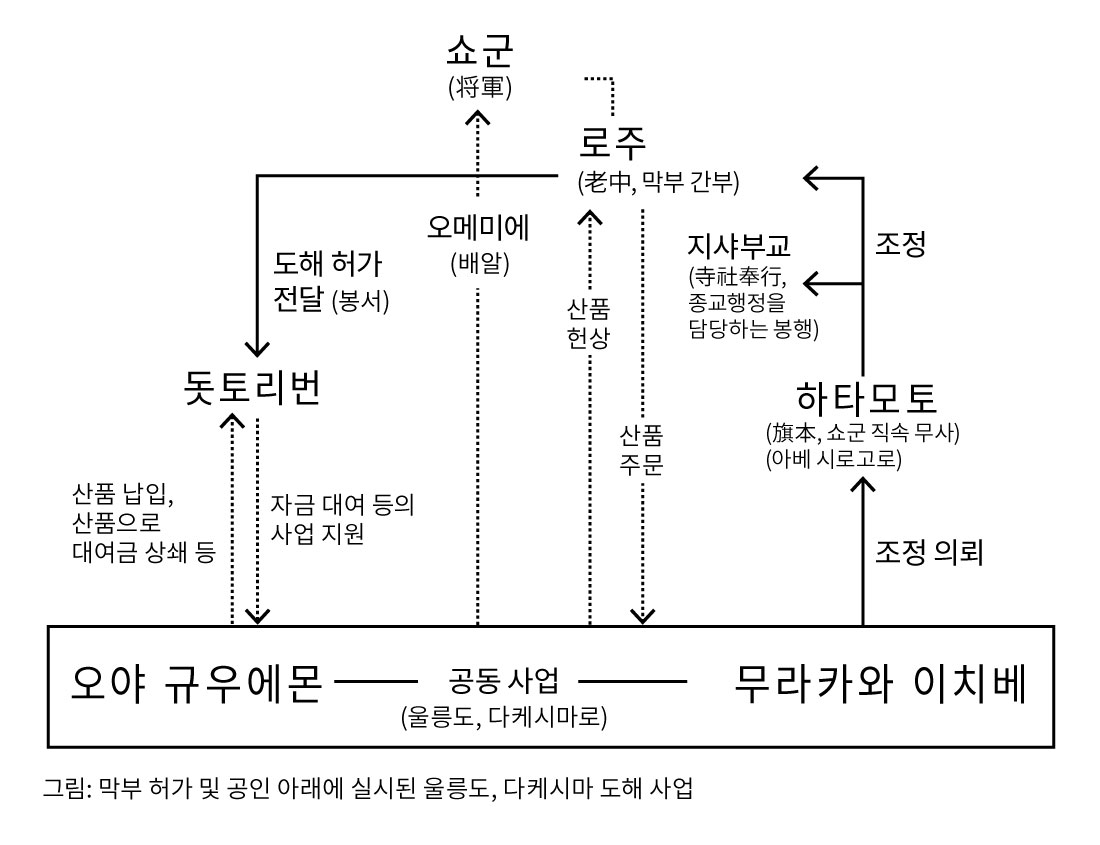 오야 가문, 무라카와 가문의 울릉도 도해는 아베 시로고로(阿倍(部)四郎五郎)(※4)라는 하타모토가 로주에게 청원해 로주가 연명(連名)으로 돗토리 번주 앞으로 허가를 냈다. 이후에도 아베 시로고로가 오야, 무라카와와 막부 사이를 중개하며 쇼군을 배알(‘오메미에’라고 불림)하거나 헌상했다 (아래 그림 참조).