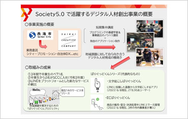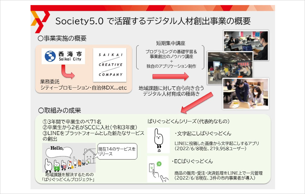 - 当取組で、プログラミングの基礎を学んだ受講者からは、地域商社である西海クリエイティブカンパニー(以下「SCC」という。)が立ち上げた、地域課題を解決するための「ばりぐっどくんプロジェクト」に参加する者も出てきた。