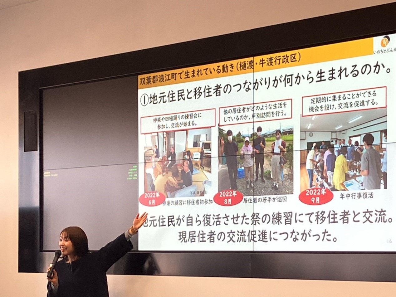 その具体例として紹介したのが、葛西氏が2021年に移住した福島県浪江町での取組です。まず、葛西氏が浪江町に移住した経緯について紹介されました。避難指示解除直後に初めて浪江町を訪れた際、駅前に音がなく「無音の町」を体験した一方、澄んだ青空に不思議な希望を感じたこと、そして「経験した街から防災を伝えていきたい」という地元職員の言葉に背中を押され、住民とともに“コミュニティや人のつながりが戻る過程”に取り組み、見届けたいと考えて移住を決めたといいます。