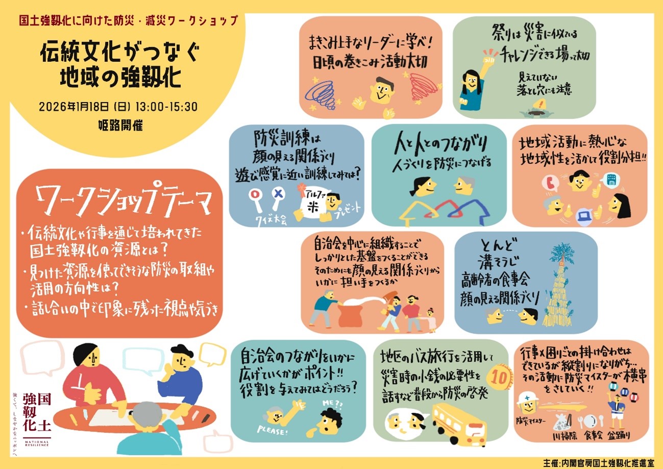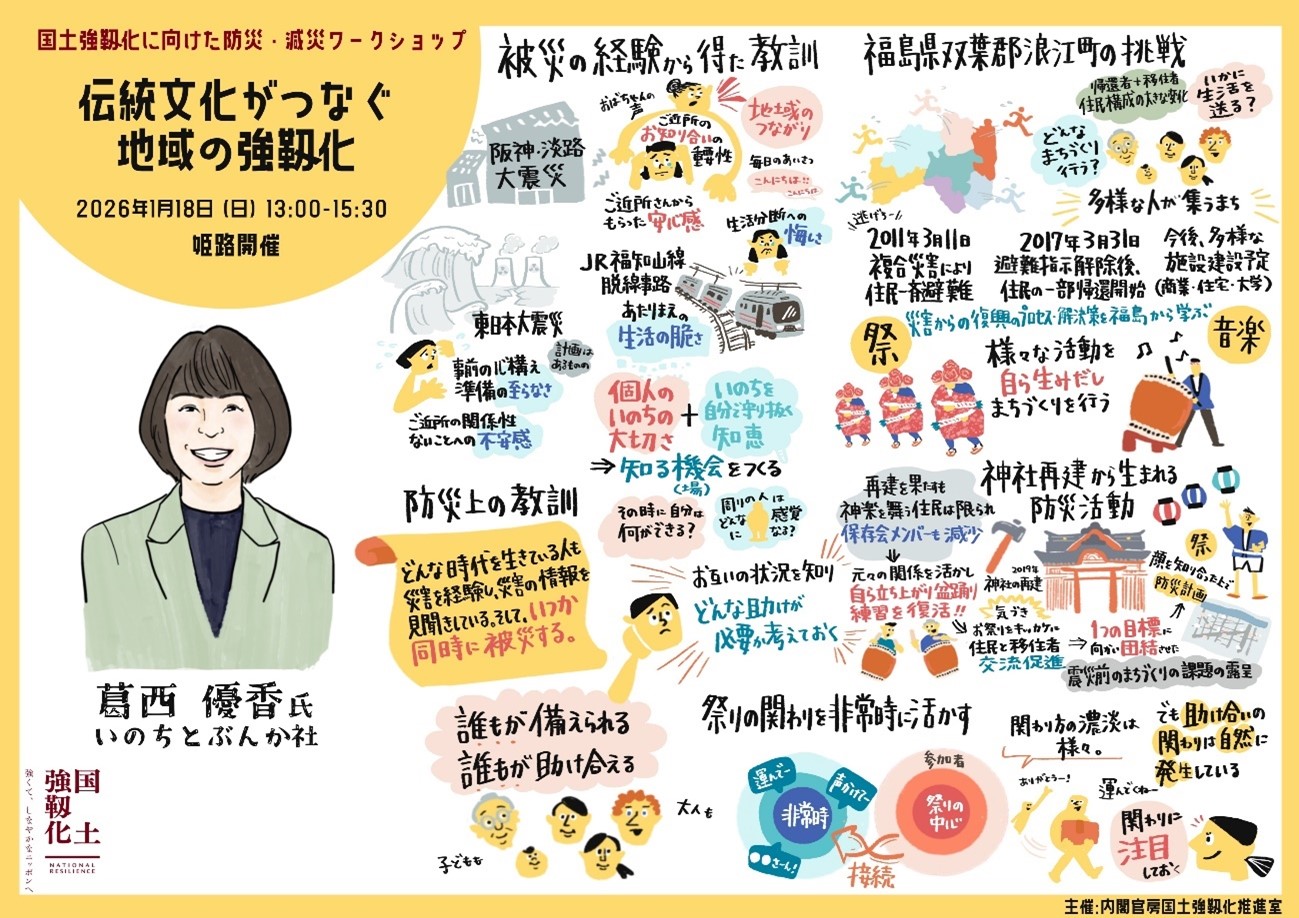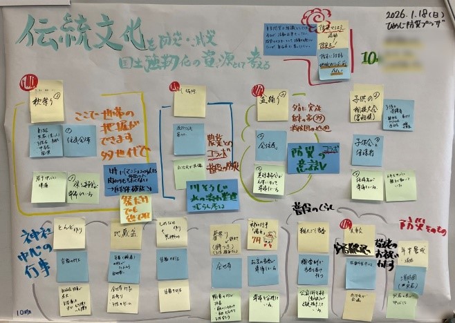 令和8年1月18日に兵庫県姫路市で開催した第1回ワークショップでは、「地域文化と防災をつなぐ」をテーマに福島県浪江町での活動事例をもとに「祭り」と「防災」を結び付けた話題提供をしていただいた後、参加者がグループワークなどを行いました。