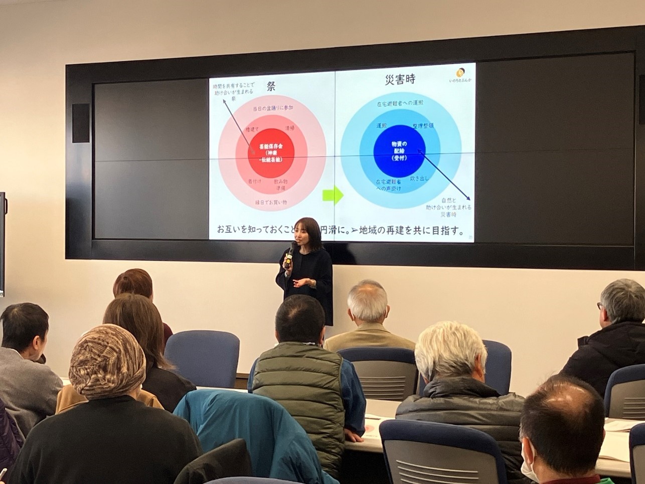 さらに葛西氏は、祭りは参加の濃淡を許容しながら、薄い関わりの人も自然に巻き込み、助け合いが立ち上がる場であると説明しました。重い荷物を見て手を貸す人、子どもが輪に入りやすいよう譲り合う人など、日常では見えにくい人の特性が表れるため、いざという時の役割分担にもつながるという考え方です。2011年の東日本大震災を契機に、防災の必要性が地域内で共有され、戸別訪問による名簿づくりや年中行事の復活を重ねる中で顔の見える関係を整え、段階的に地区防災計画づくりへ発展させたプロセスも示しました。最初から防災を前面に出すのではなく、「普段の営みの中に防災を重ねる」ことで継続しやすくなるといいます。