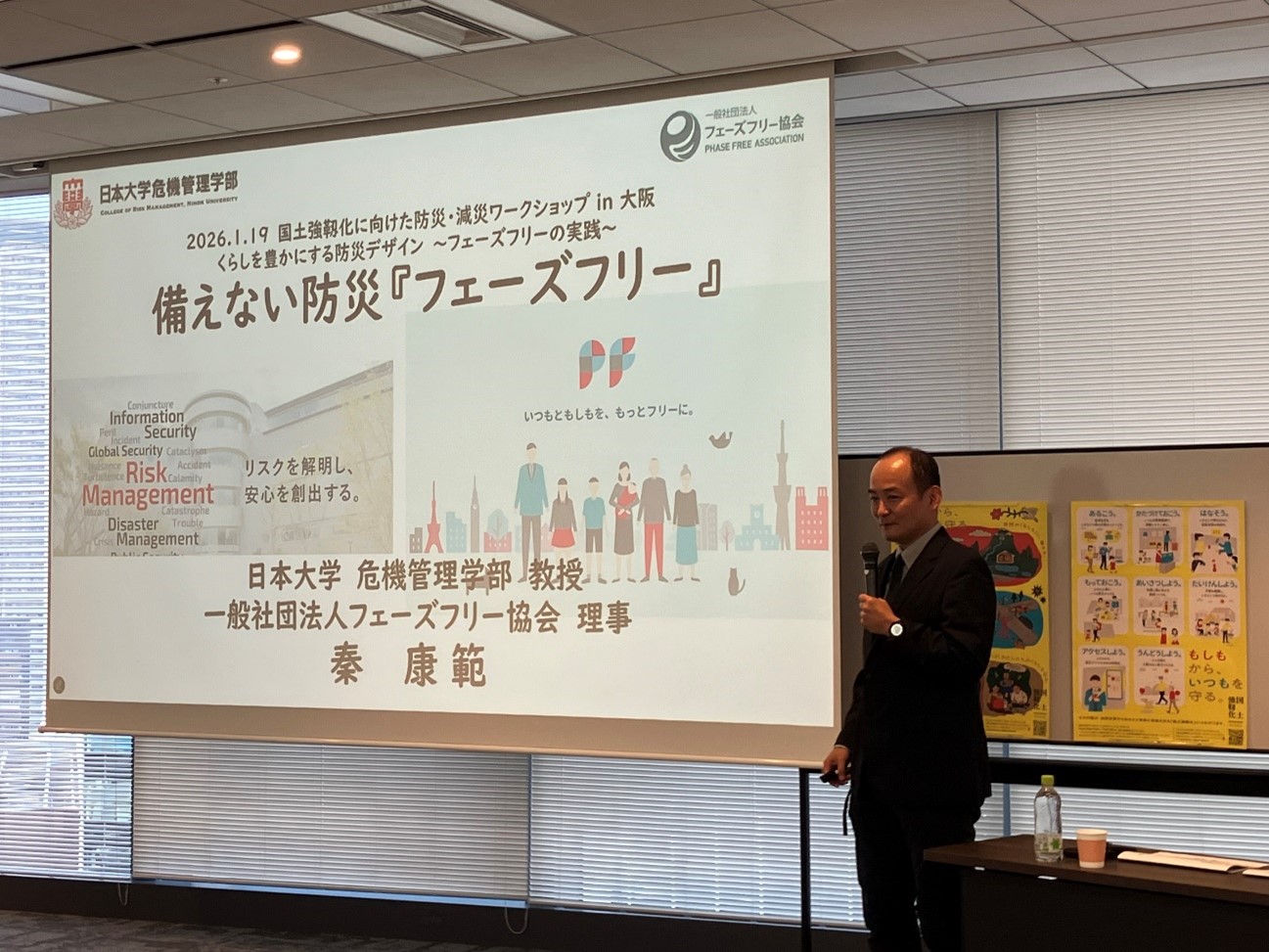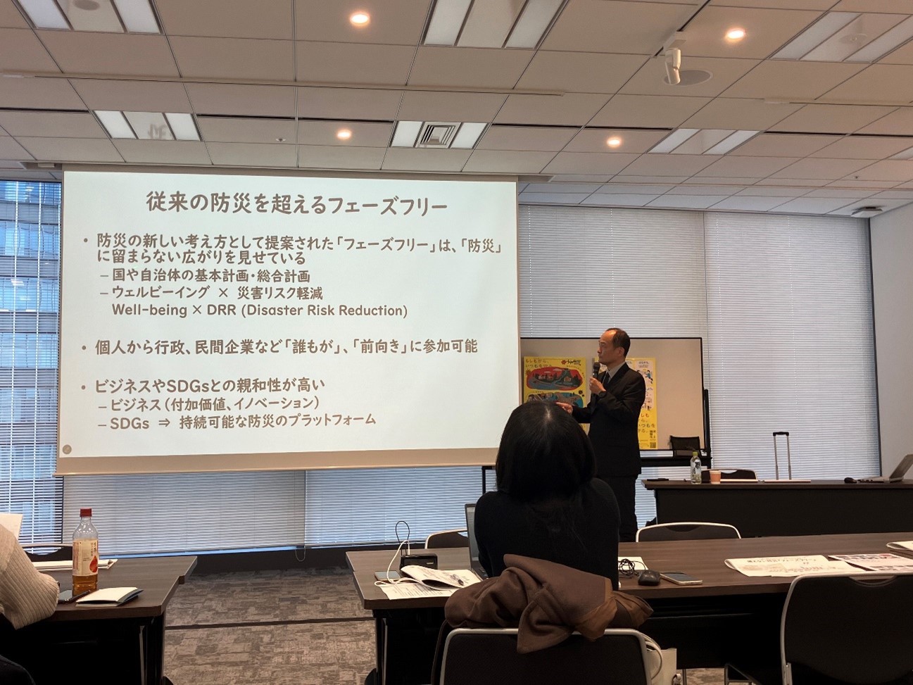 また秦氏は、フェーズフリーは防災分野にとどまらず、まちづくりや行政計画、教育、企業活動とも親和性が高い概念だと説明しました。防災部局だけでなく、福祉、教育、産業、都市計画など多様な分野が関わることで、地域全体の生活の質を高めながら、結果として国土強靱化につながると強調しました。