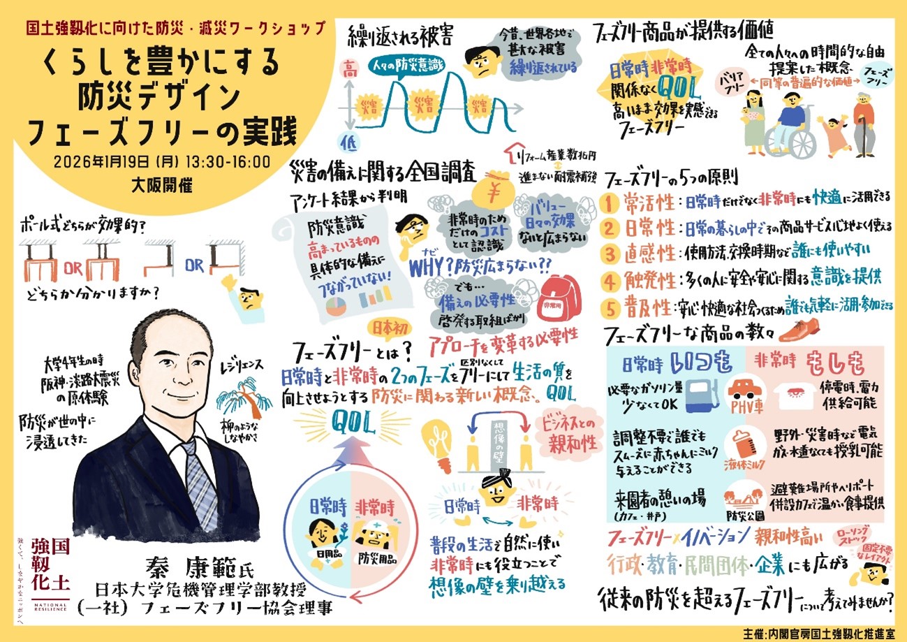 今回のワークショップでは、秦氏の講演を通じて、日常の便利さや快適さを高める工夫が、そのまま災害時の備えにもなるというフェーズフリーの考え方が共有されました。特別な防災対策だけに頼るのではなく、日頃使っているもの、慣れている行動、身近なつながりを見直すことが、無理なく続く国土強靱化の実践につながることが示されました。国土強靱化は特別な取組として構えるのではなく、日々の暮らしの中にある工夫や選択を少しずつ積み重ねていくことから始まる、という方向性が改めて確認されました。