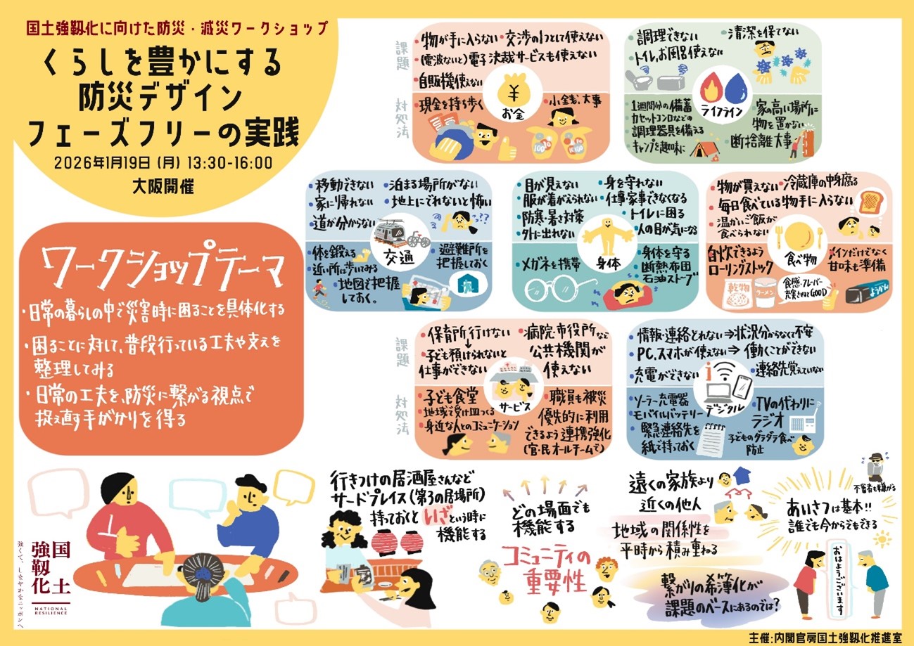 令和8年1月19日に大阪府大阪市で開催した第2回ワークショップでは、「備えない防災『フェーズフリー』」をテーマに、「日常時」と「非常時」を切り分けずに考えるフェーズフリーの考え方について話題提供をしていただきました。その後参加者がグループワークを通じて、災害時に困ることに対して日常の中でどのような工夫ができるかを議論しました。