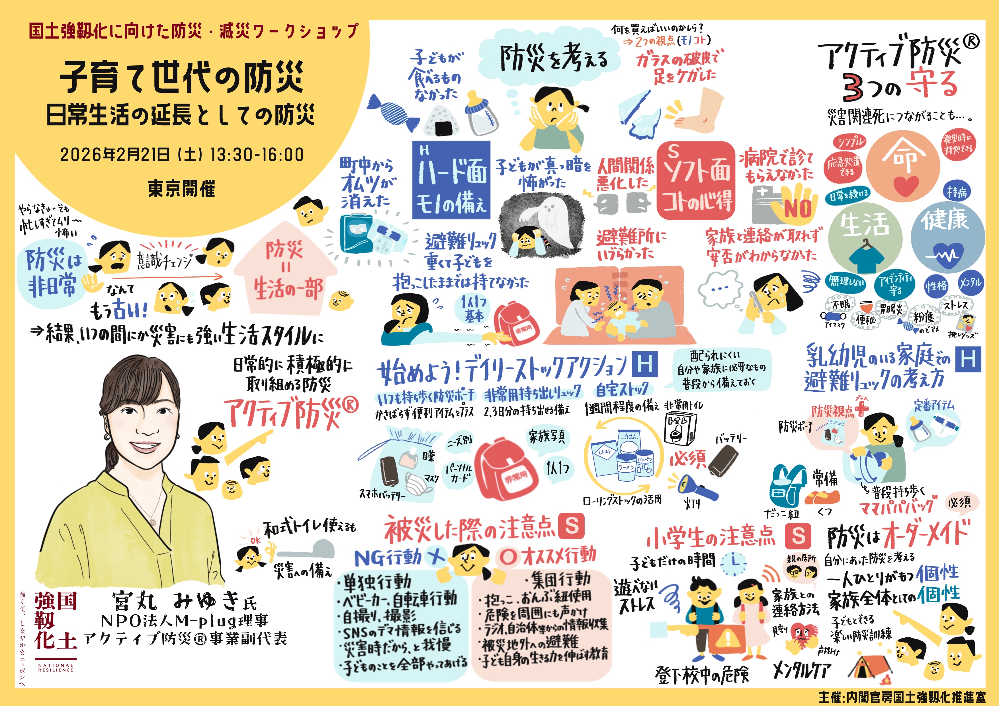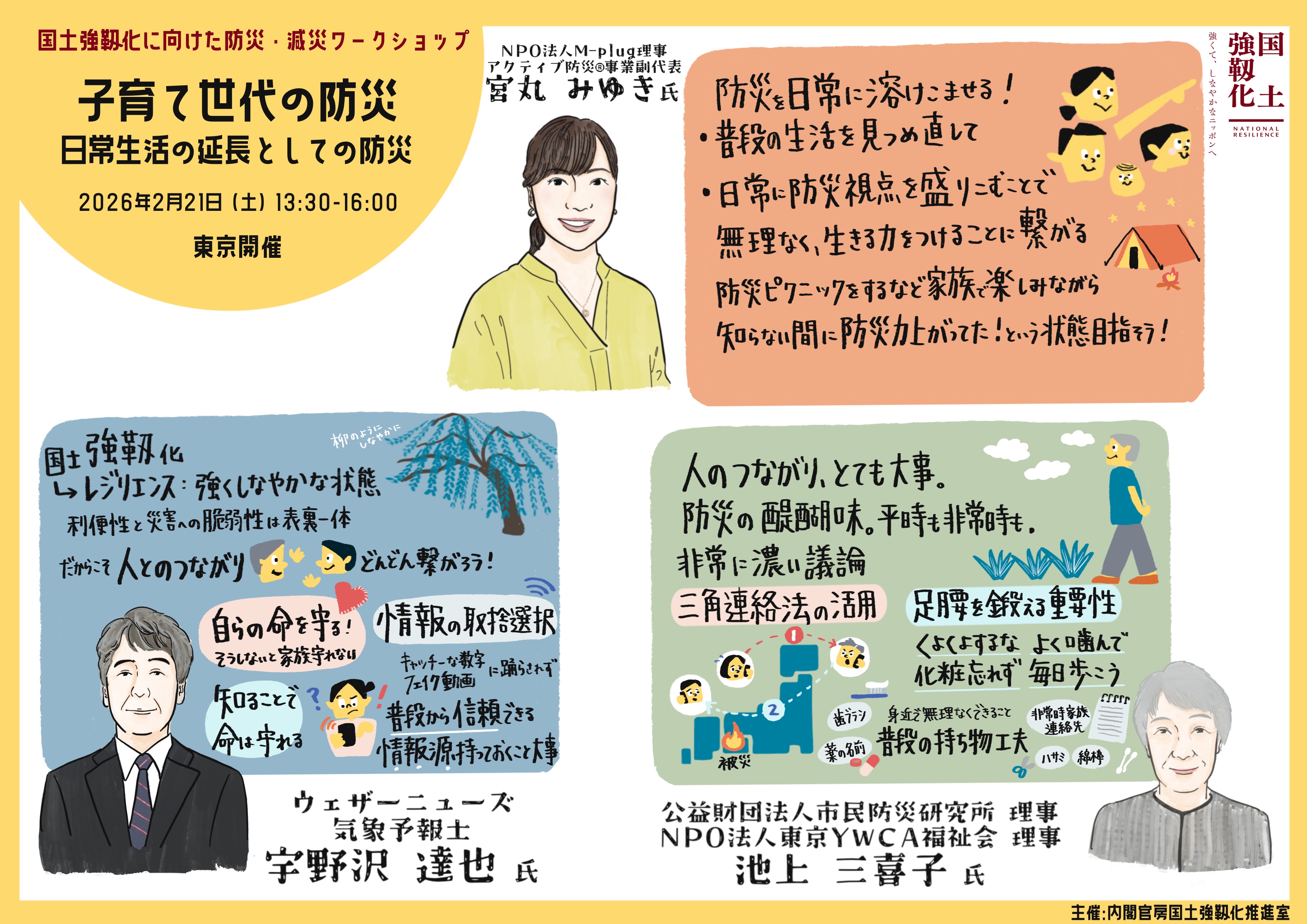 今回のワークショップでは、子育て世帯の防災を切り口に、国土強靱化を日常生活の中でどう実践していくかが議論されました。宮丸氏の話題提供を通じて、備えは「もの」だけではなく「こと」と一体で考える必要があること、さらに「命」だけでなく「健康」「生活」も守る視点が不可欠であることが共有されました。