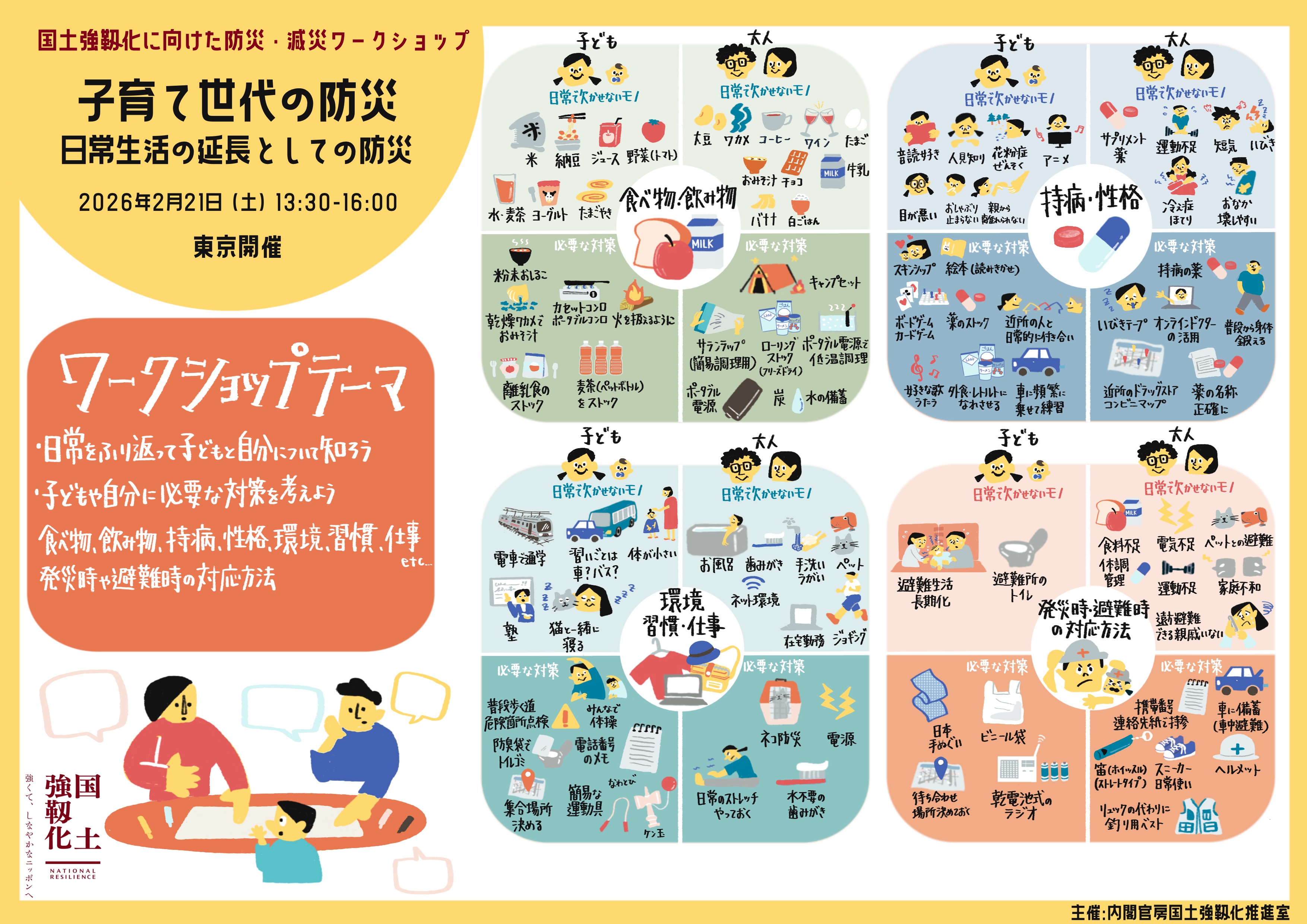 令和8年2月21日に東京都内で開催した第4回ワークショップでは、「子育て世代の防災を考える」をテーマに、子どもがいる家庭における防災の備えや、日常生活の中で無理なく取り組める防災の工夫について話題提供をしていただきました。その後参加者がグループワークを通じて、災害時に困ることに対して日常の中でどのような工夫ができるかを議論しました。